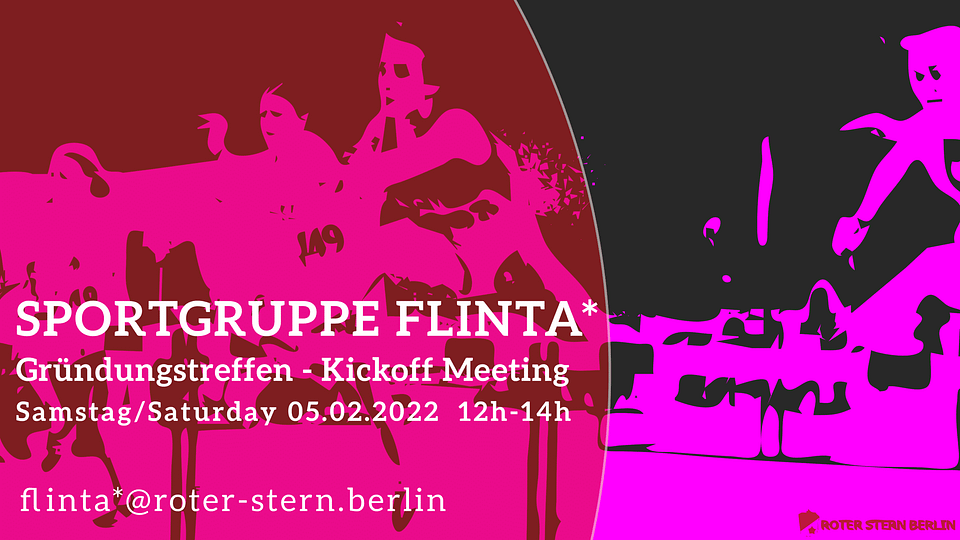 es ist soweit: Die SG FLINTA* gründet sich im Roten Stern Berlin 2012 und lädt ein zum Gründungstreffen am 5.2.22, um 12 Uhr, via Zoom.